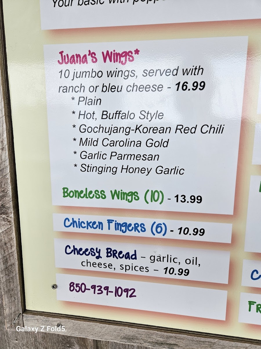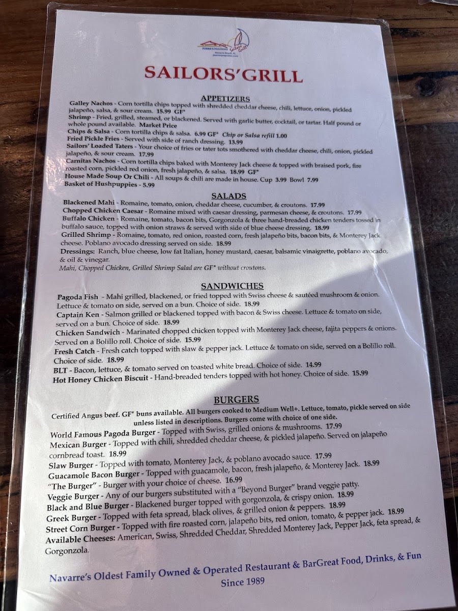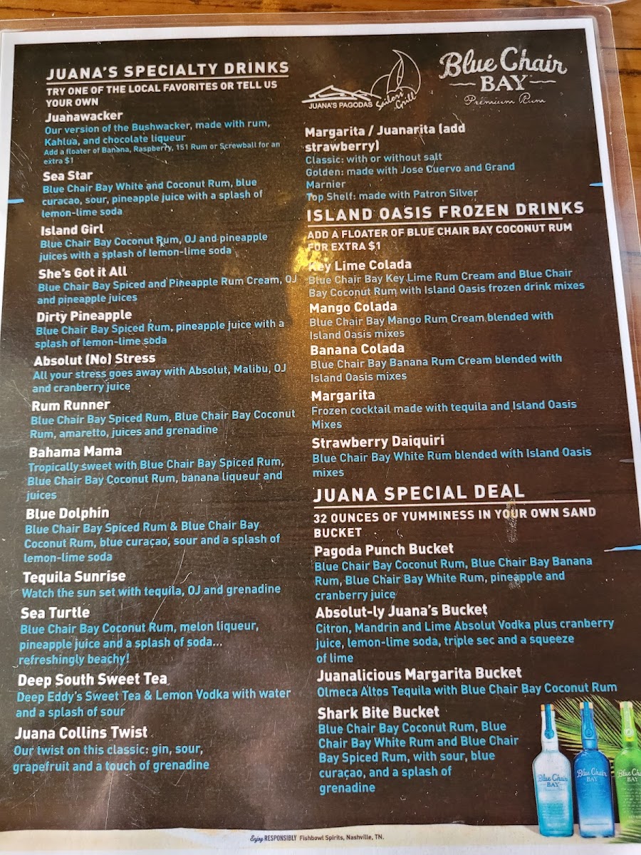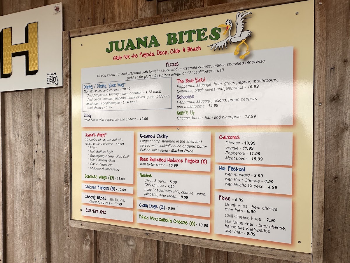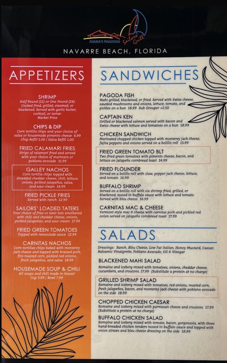 Juana’s Pagodas & Sailors’ Grill in Navarre, FL, is a vibrant bar & grill offering a delicious blend of coastal and Caribbean-inspired flavors. The menu stars a variety of expertly crafted tacos, including blackened fish with creamy poblano avocado ranch, spicy jerk chicken bursting with tangy pickled onions, and flavorful shrimp with chipotle BBQ sauce. For burger lovers, their World Famous Pagoda Burger with Swiss and sautéed mushrooms, and the bold Mexican Burger topped with house chili and pickled jalapeños, stand out as must-tries. Every dish is complemented by a choice of satisfying sides like crispy tater tots, golden onion rings, and creamy mac & cheese. Juana’s delivers not only great taste but warm, attentive service, making each visit memorable. Whether you're craving fresh seafood tacos or a perfectly cooked bacon BBQ burger, this spot brilliantly combines seaside charm with bold, comforting flavors that invite you to relax and savor every bite.